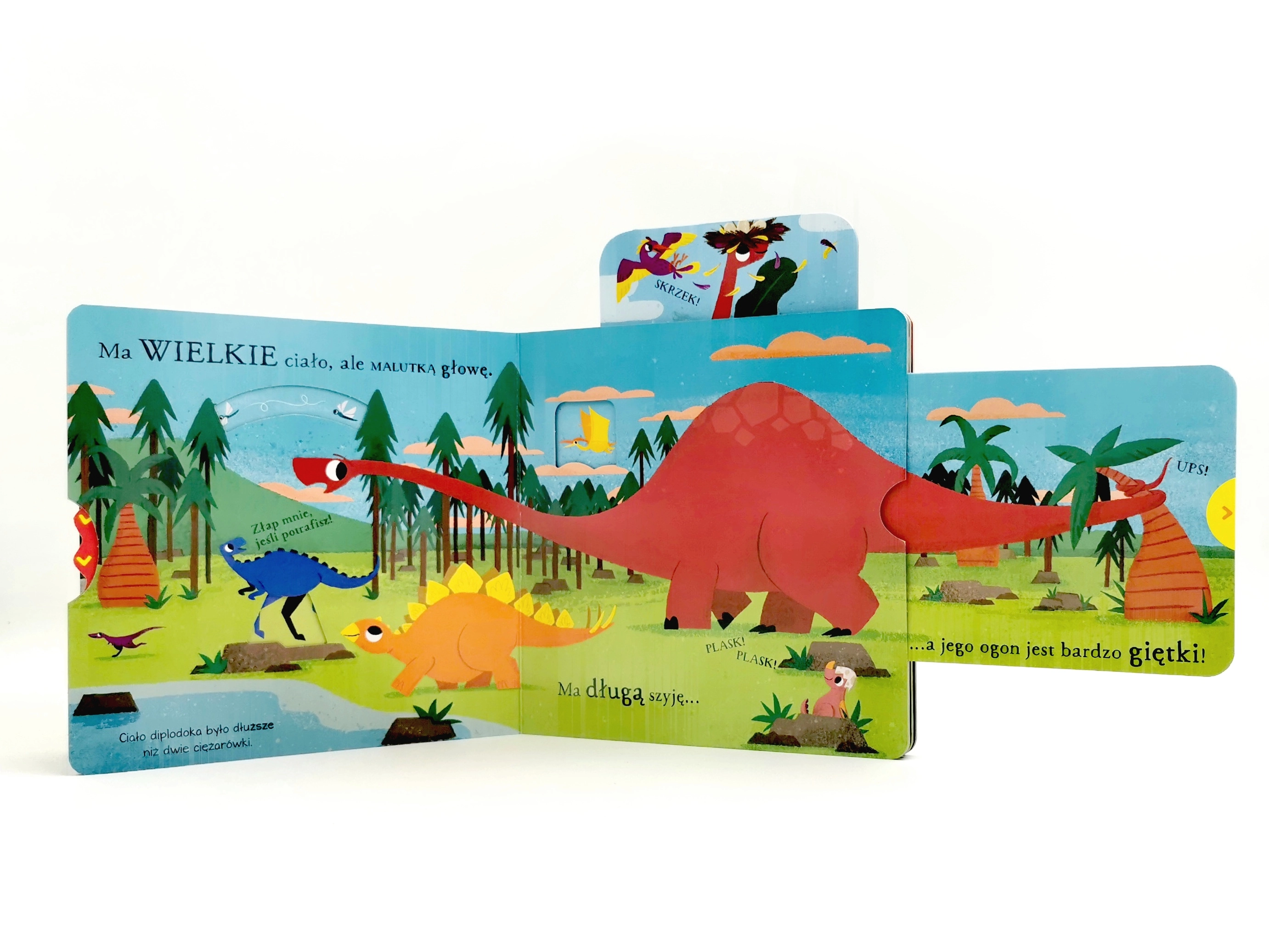 Akademia Mądrego Dziecka. Poznajemy dinozauryto nowa seria kartonowych książeczek z ruchomymi elementami dla małych wielbicieli prehistorycznych gadów. Na każdej stronie mały czytelnik znajdzie ciekawe fakty z życia dinozaurów. Książeczka pod tytułem Diplodok przedstawia ciekawe fakty z życia tego roślinożernego gada. Dowiadujemy się jaki wielką wagę miał dinozaur oraz po co mu była tak długa szyja. Czy ktoś z was wie? Na każdej stronie mamy ruchomy element, co sprawia, że czytanie jest też zabawą pozwalającą ćwiczyć paluszki maluszkom.