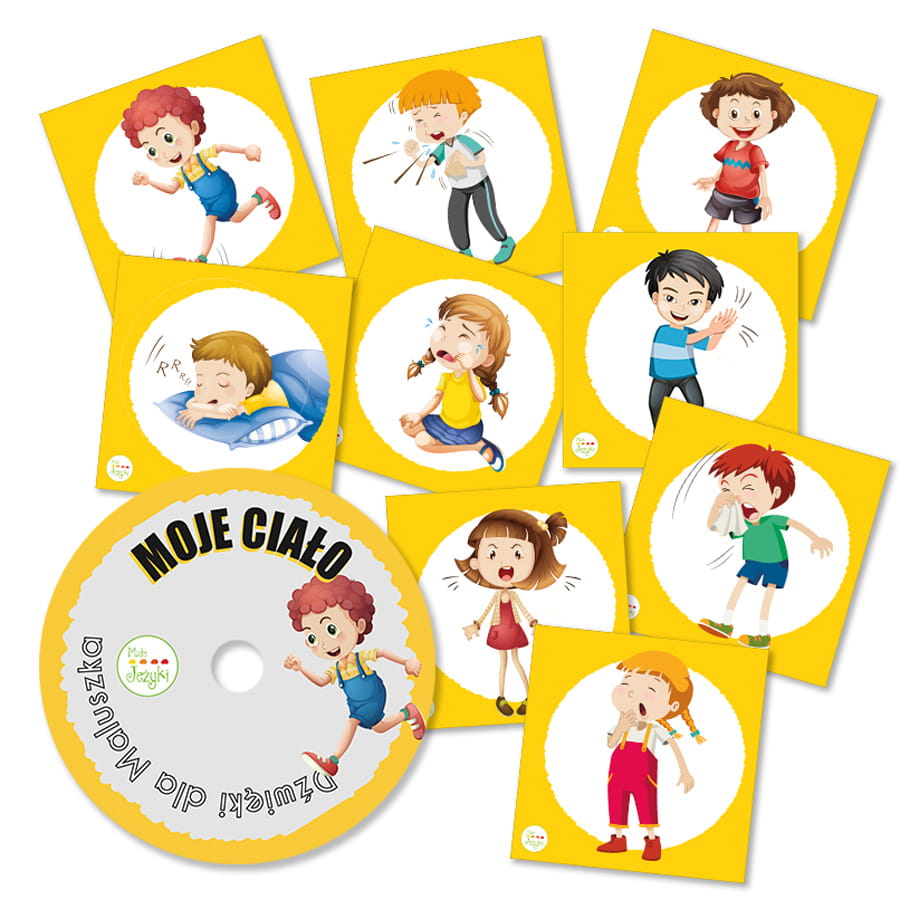 Na 9 kartach, wielkości 30/30 nadrukowaliśmy obrazki dotyczące ciała człowieka np kichnięcie, krzyk, płacz, śmiech, a na płycie CD nagrane ich brzmienie.
