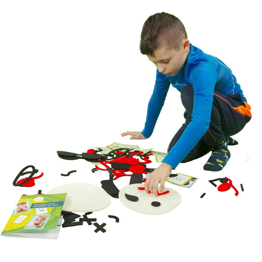Emocje mam układam je sam to produkt wykonany z grubego, trwałego filcu. Zawiera on dwa koła imitujące twarz oraz elementy ruchome w postaci filcowych oczu, brwi, polików, ust, które wykonane są na różne sposoby.