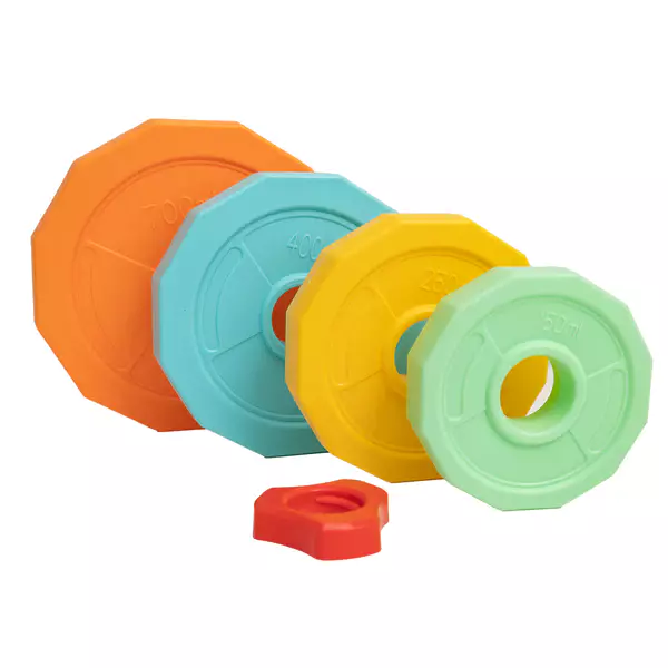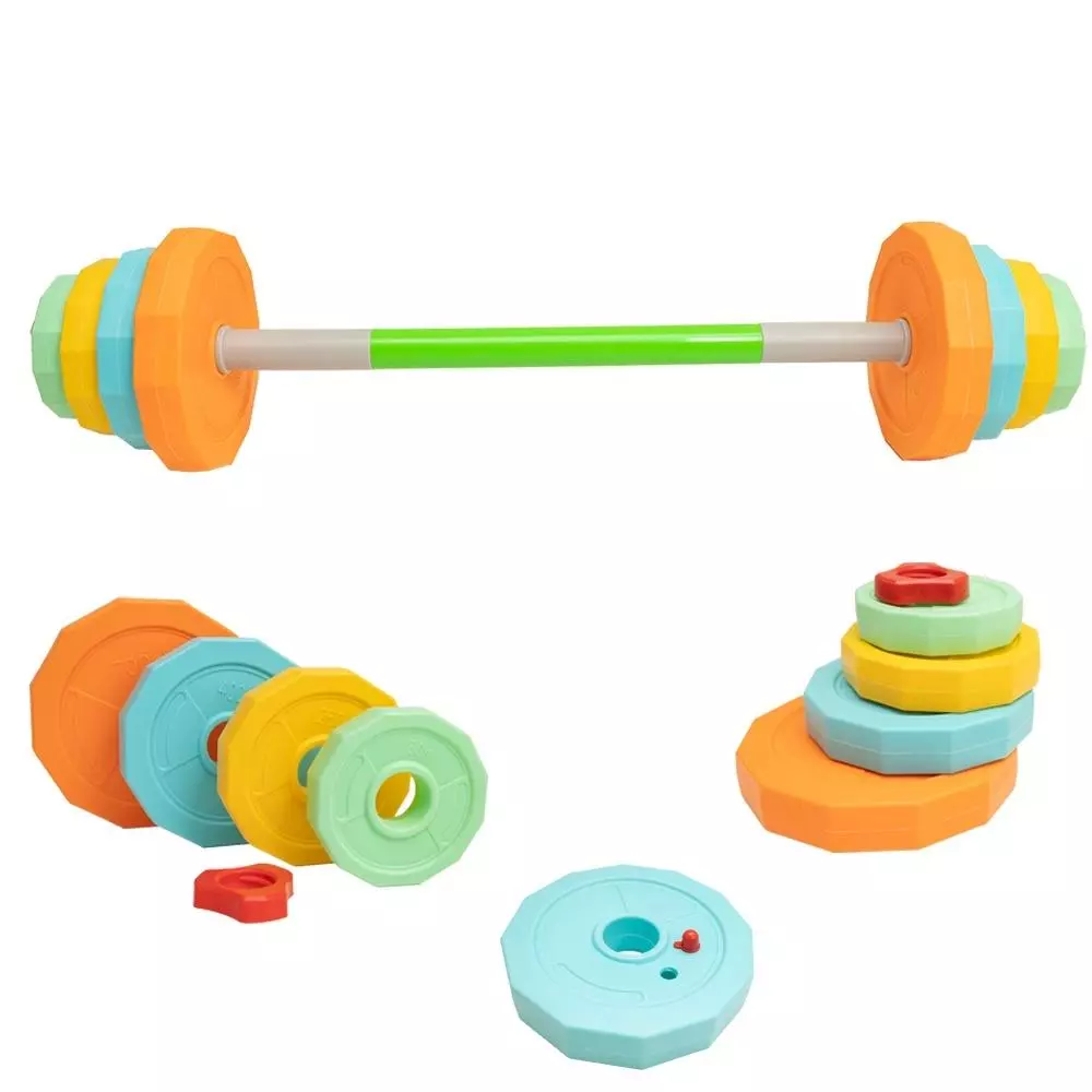 Kolorowa sztanga dla dzieci z możliwością regulacji wagi – aktywna zabawa i sportowe emocje! Ta kolorowa sztanga to świetna propozycja dla dzieci, które lubią ruch, sport i aktywne zabawy. Dzięki możliwości napełniania obciążeń wodą, można łatwo dopasować wagę sztangi do możliwości dziecka. Maksymalna waga po napełnieniu to aż 3 kg! Kolorowe obciążniki i ich pojemności: Pomarańczowy – 700 ml, niebieski – 400 ml, żółty – 250 ml, zielony – 150 ml. Całkowita długość sztangi: 75 cm.