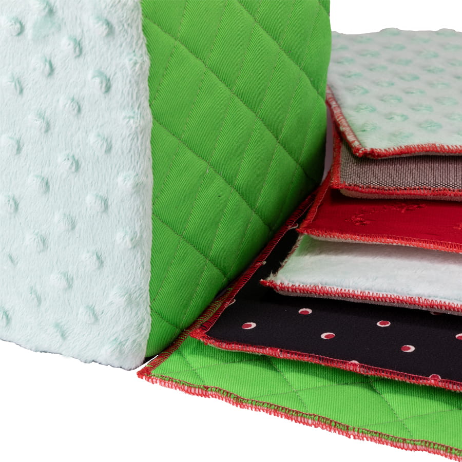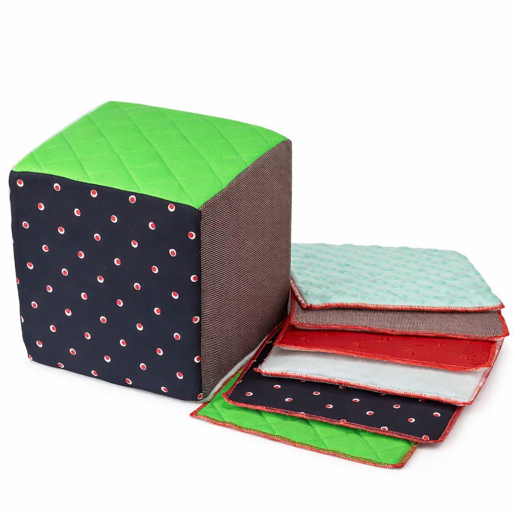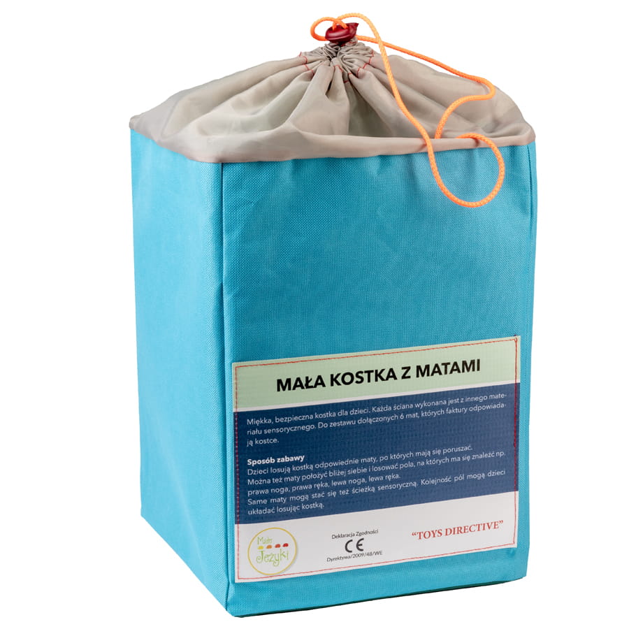 Kostka o wymiarach 20cm x 20cm x 20cm obszyta materiałami sensorycznymi. W komplecie dodatkowo 6 mat (20cm x 20cm) podszytych antypoślizgową pianką, których faktury odpowiadają kostce. Produkt ten można wykorzystywać na różne sposoby do zajęć terapeutycznych.
