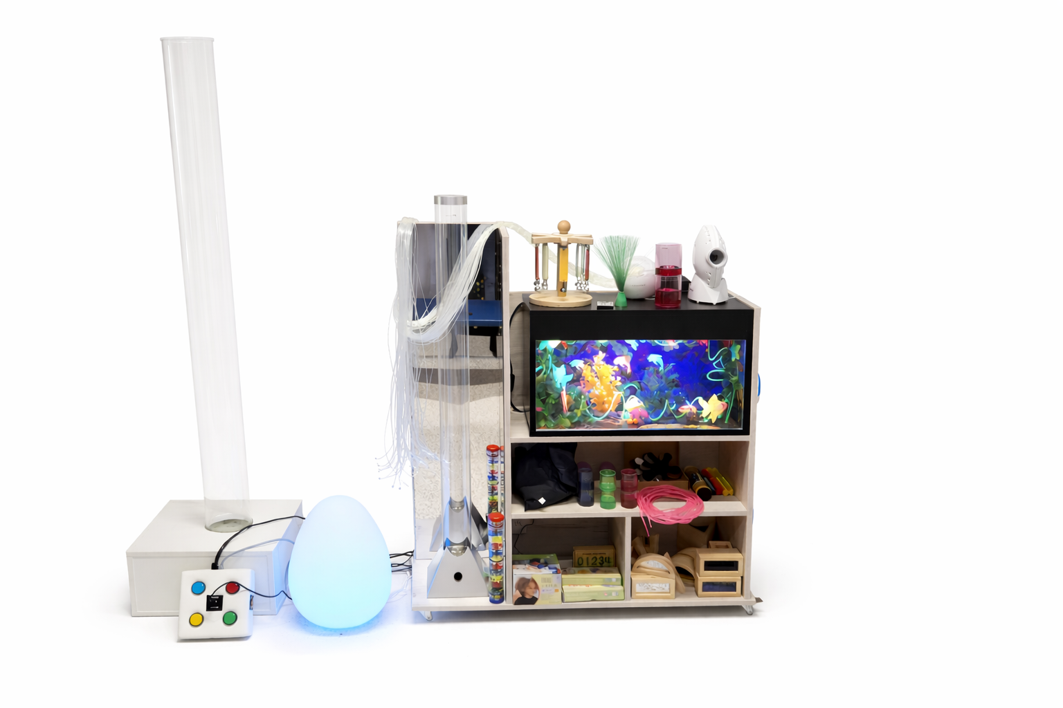 Mobilna sala doświadczania świata to kompletna, gotowa do pracy mini sala Snoezelen na mobilnym wózku, która pozwala prowadzić terapię polisensoryczną tam, gdzie akurat jej potrzebujesz – w gabinecie, przedszkolu, szkole, świetlicy, a nawet w domu. To idealne rozwiązanie dla miejsc, które nie mają wydzielonego pomieszczenia na stałą salę doświadczania świata, a chcą korzystać z mocy światła, koloru, ruchu i przyjaznych bodźców.