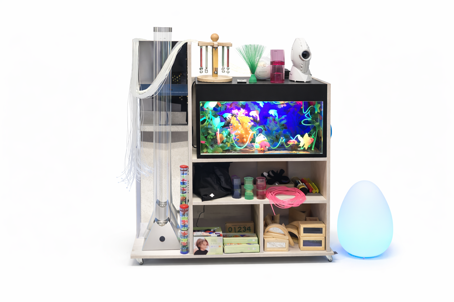 Wózek posiada kółka, dzięki czemu łatwo przestawisz zestaw i szybko zorganizujesz strefę wyciszenia lub aktywności sensorycznej w dowolnej sali.