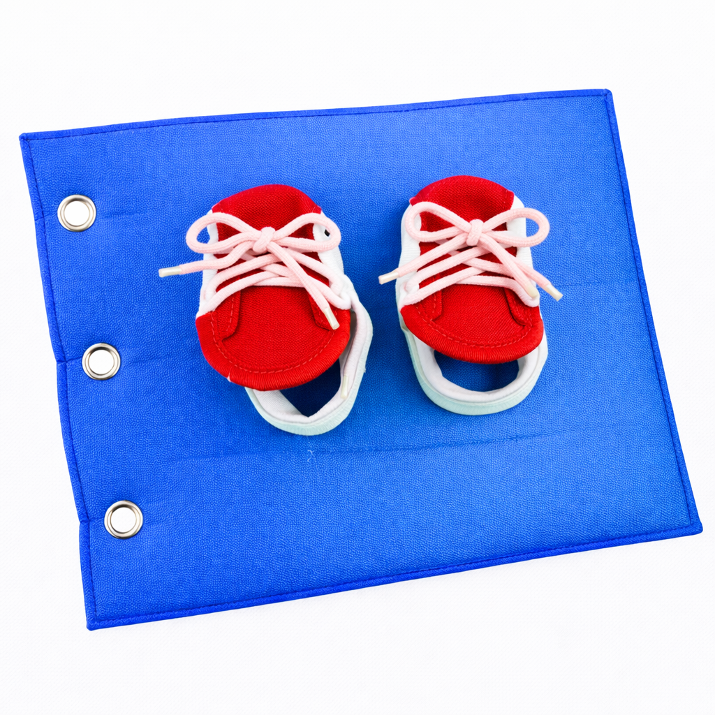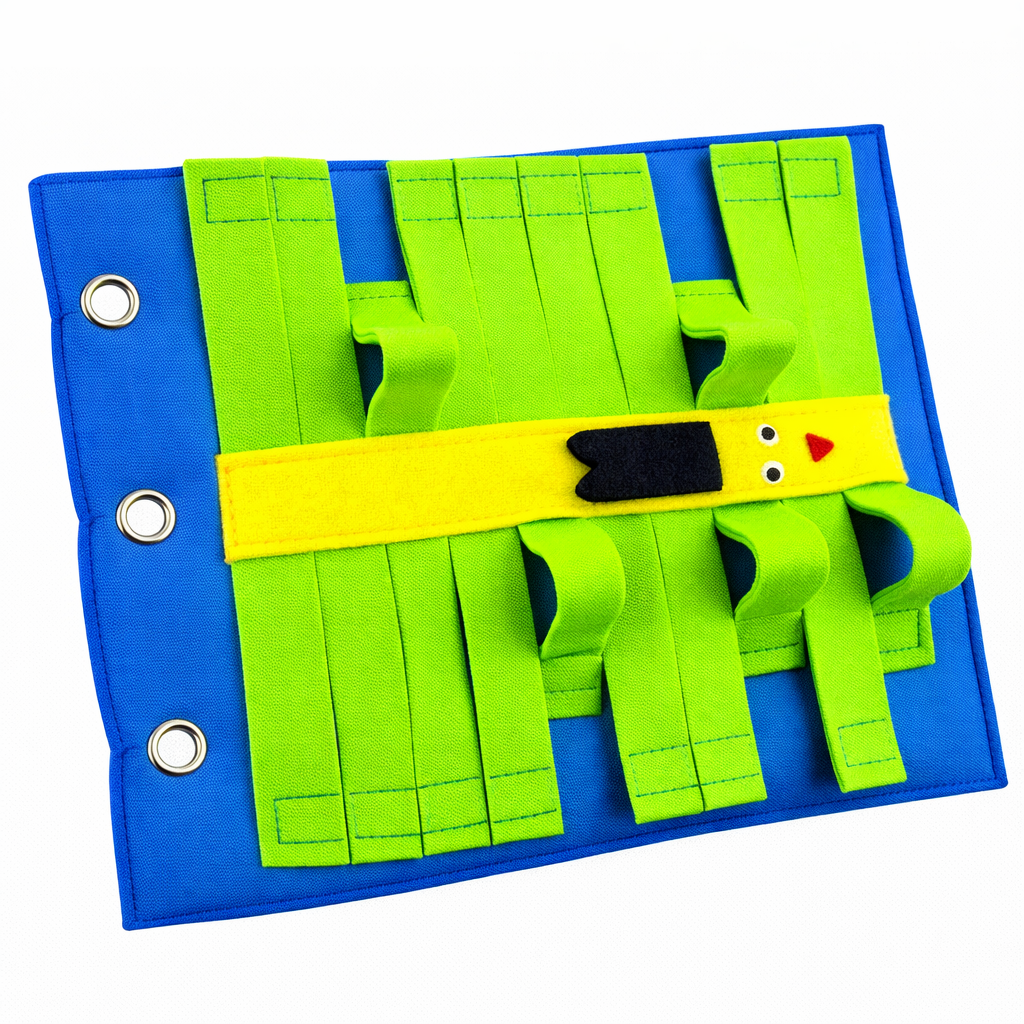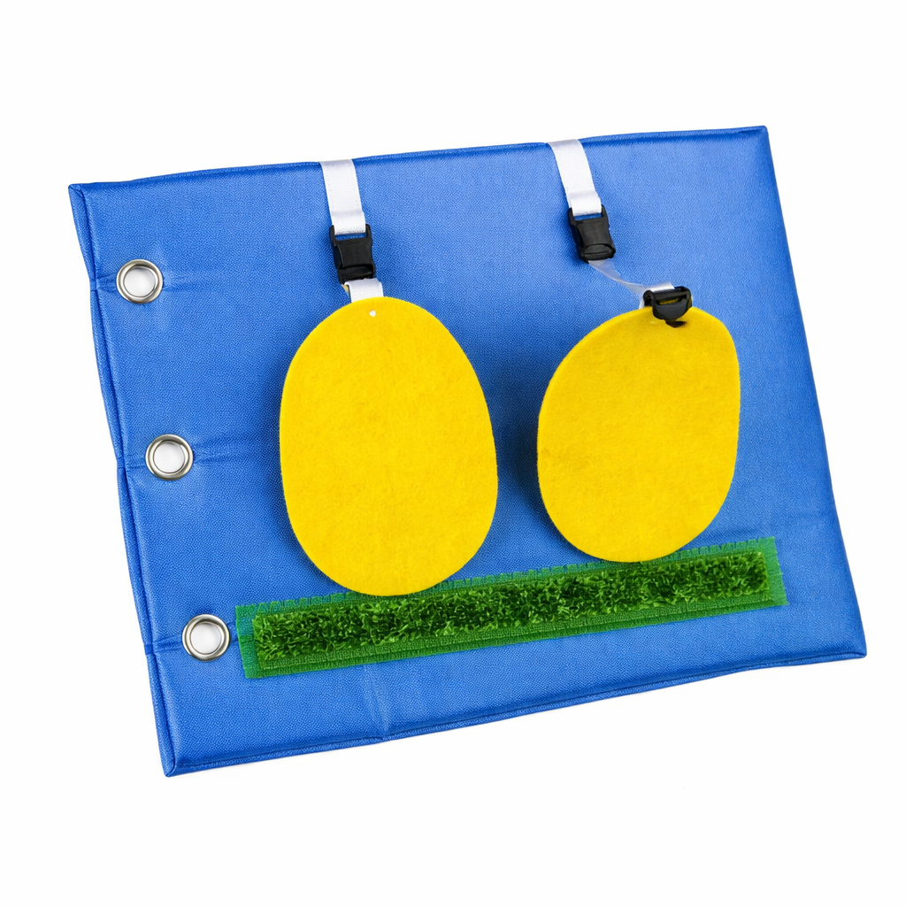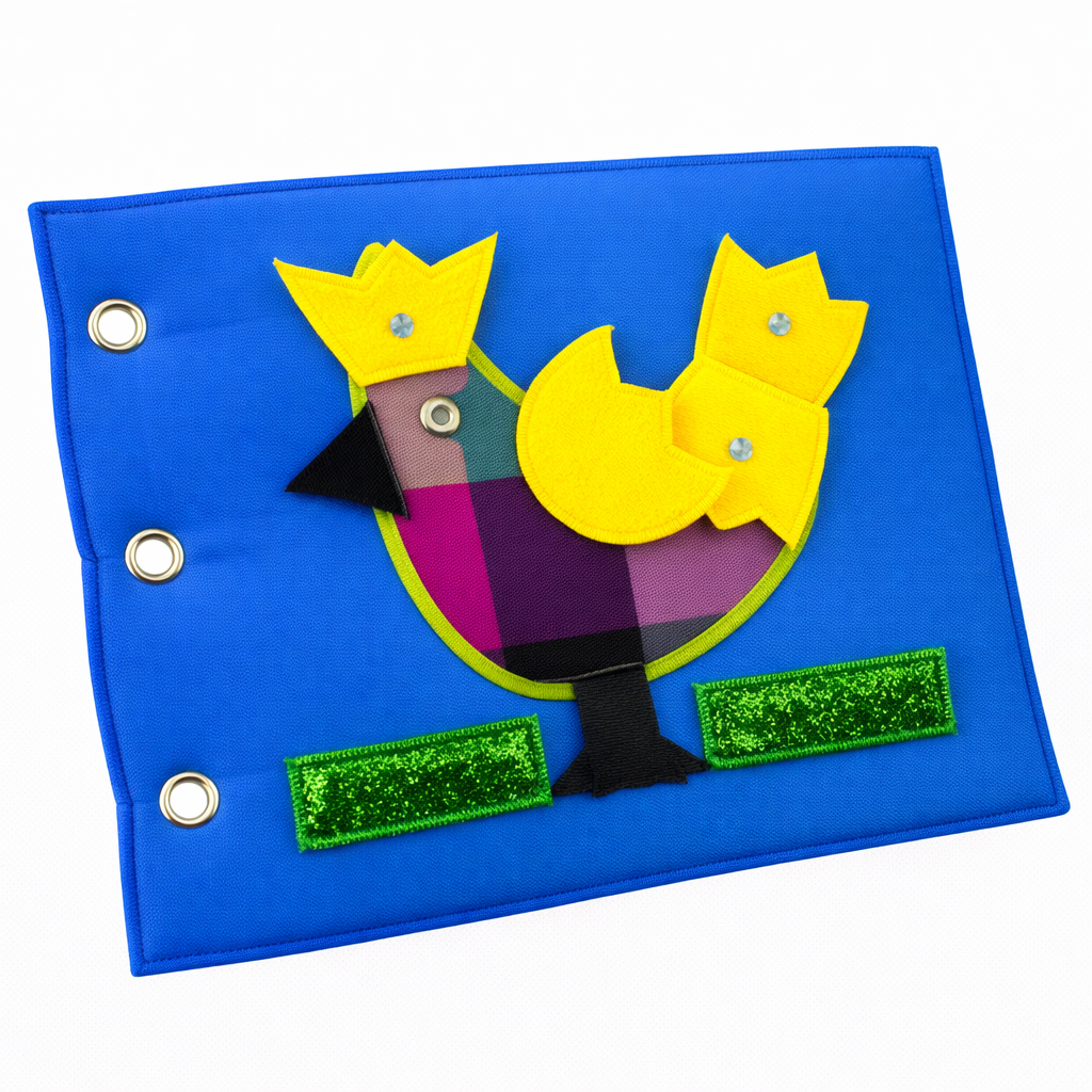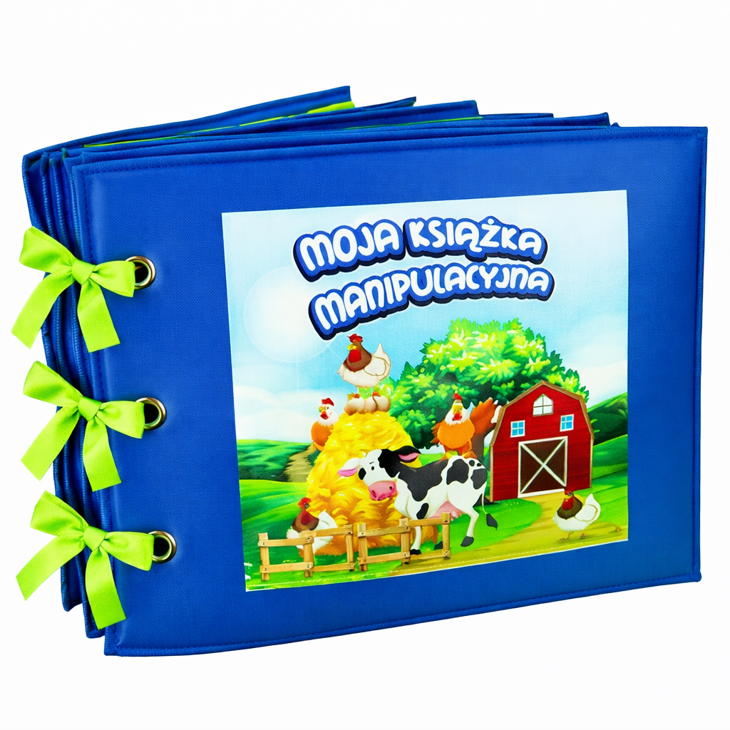 Moja książka manipulacyjna to miękka, materiałowa książeczka o wymiarach 22 × 28 cm, składająca się z 20 stron pełnych bodźców sensorycznych i elementów do manipulacji.