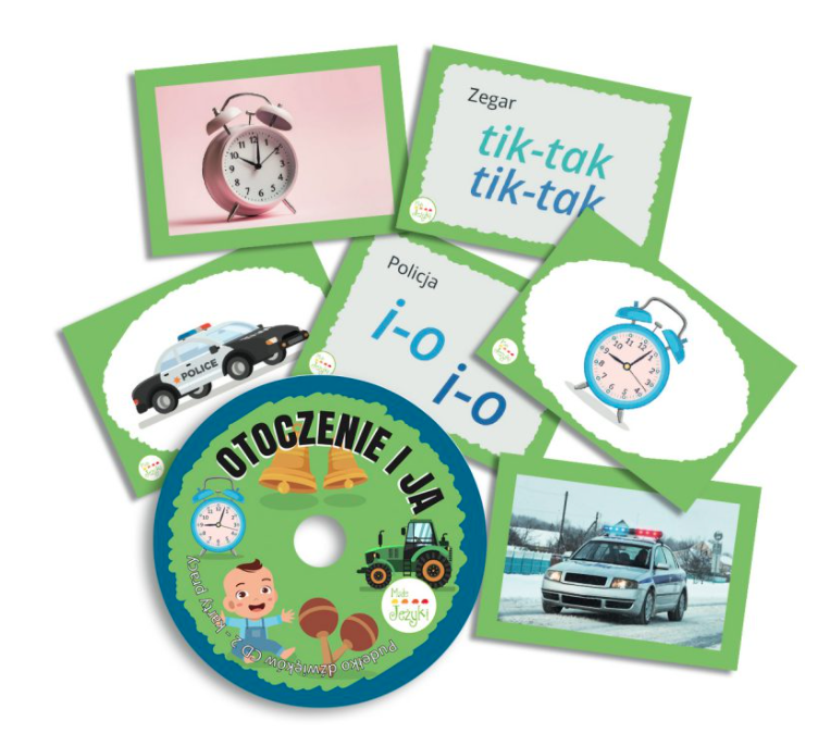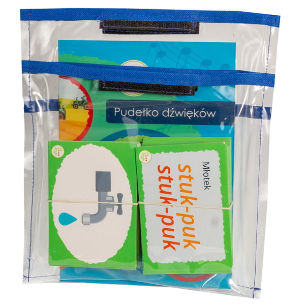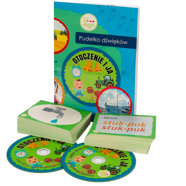 Pudełko dźwięków to pomoc dydaktyczna, która z powodzeniem może być wykorzystana przez logopedów, a także innych specjalistów i nauczycieli. Wspiera ona znakomicie rozwój poznawczy dziecka oraz w zabawny i ciekawy sposób poprawia motorykę aparatu mowy . Produkt stworzyliśmy z 99 kart przedstawiających otoczenie dziecka, z którym spotyka się ono na codzień. Na części kart przedstawiliśmy fotografie w naturalnym otoczeniu. Kolejne karty to obrazkowe odpowiedniki, a trzecia grupa kart to onomatopeje. Do zestawu załączyliśmy książkę, w której znajdziecie dużą liczbą zabaw oraz dwie płyty CD. Na jednej płycie nagraliśmy odgłosy odpowiedajace prezentowanym kartom. Na tej płycie znajdziecie też zabawy muzyczne oparte o te odgłosy. Na drugiej płycie znajdziecie karty pracy, które wykorzystacie też podczas zabawy.