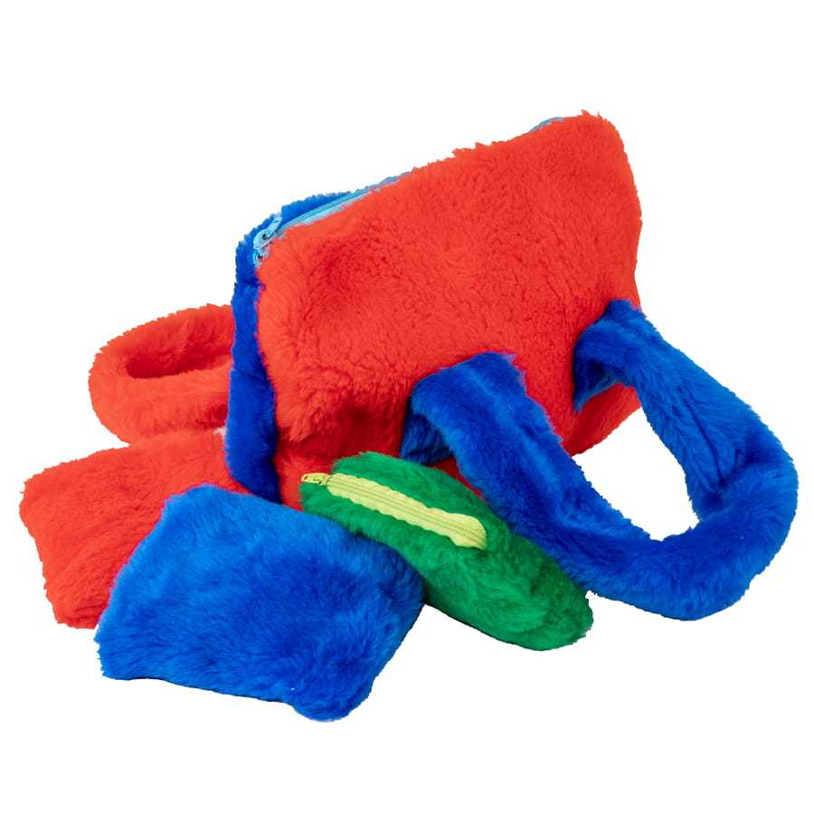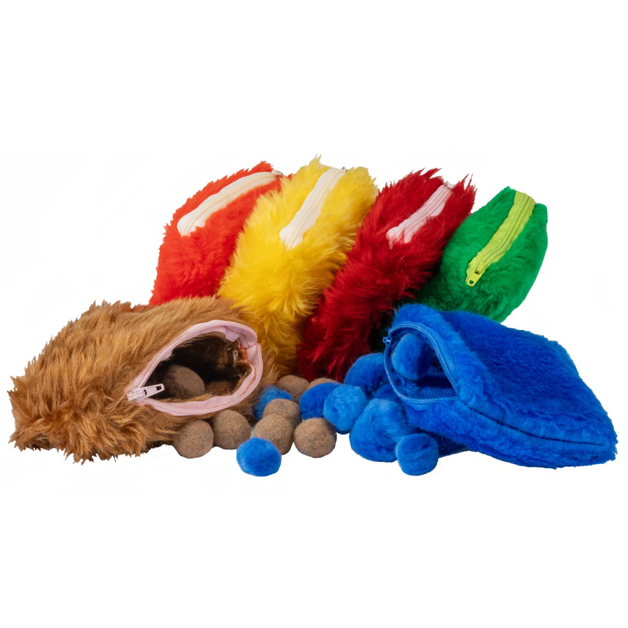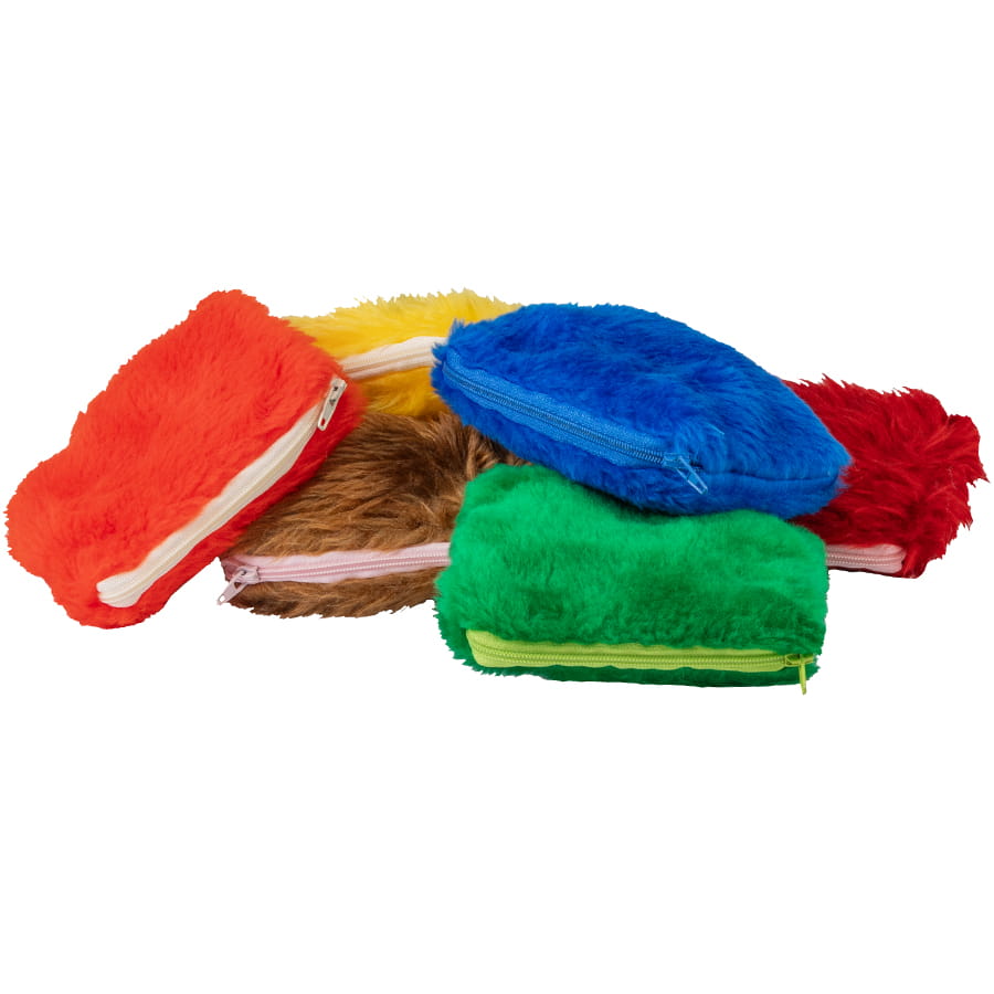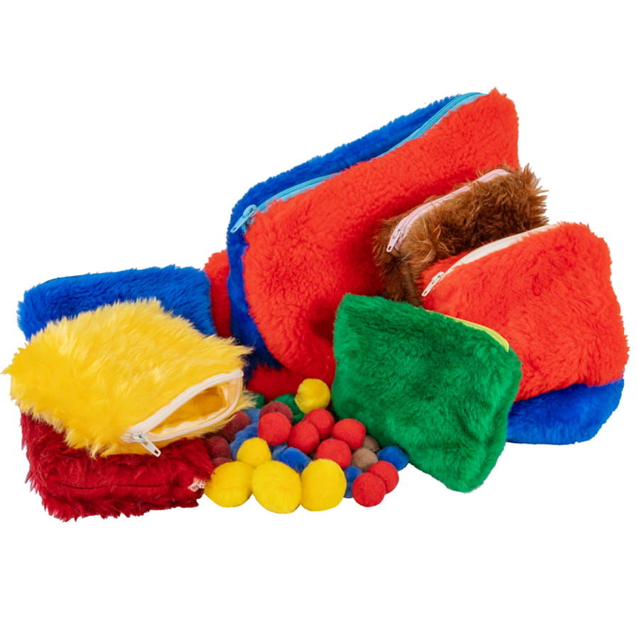 Zestaw sześciu portfelików sensorycznych. Każdy wykonany z materiału o innym kolorze. Niektóre różnią się również w dotyku. Jedne mają nieco dłuższy a inne nieco krótszy włos. W zestawie znajdują się miękkie pomponiki, które dziecko ma za zadanie włożyć do odpowiedniego portfelika wg koloru. Pomoc wykorzystuje wrażenia sensoryczne, ćwiczy motorykę małą. Każdy portfelik dodatkowo jest zamykany na zamek. Wszystkie włożone są do jednej dużej, kolorowej i puchatej torebki, która również zamknięta jest na zamek.