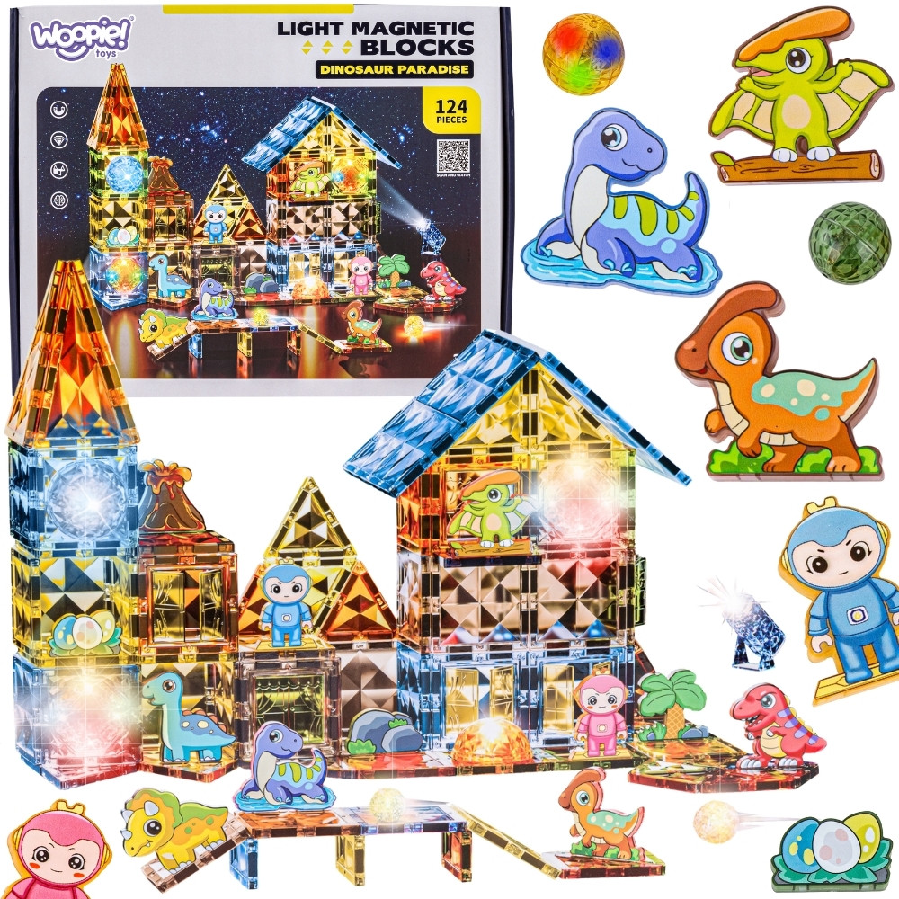 WOOPIE Klocki Magnetyczne Konstrukcyjne Świecące 3D Park Dinozaurów 124el.