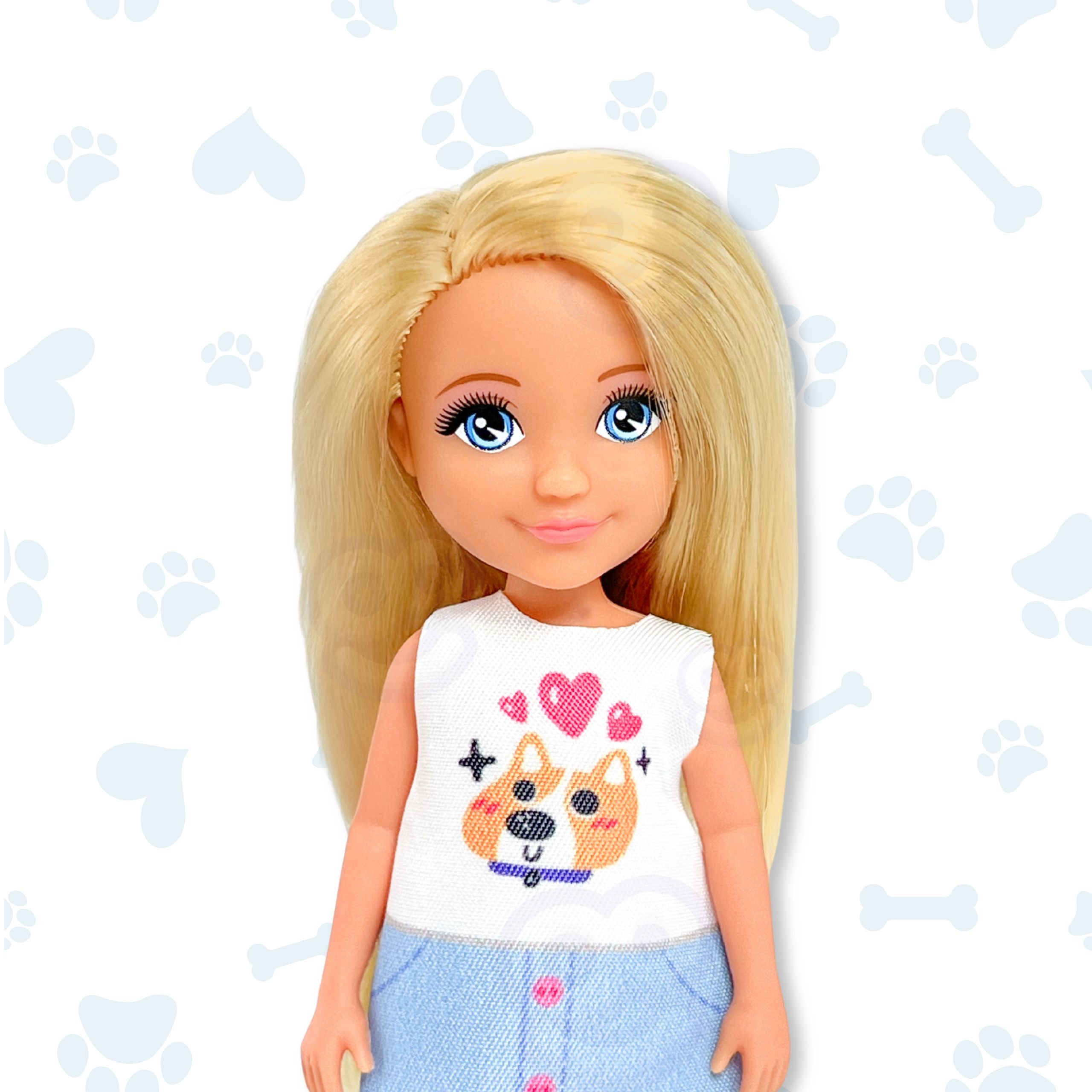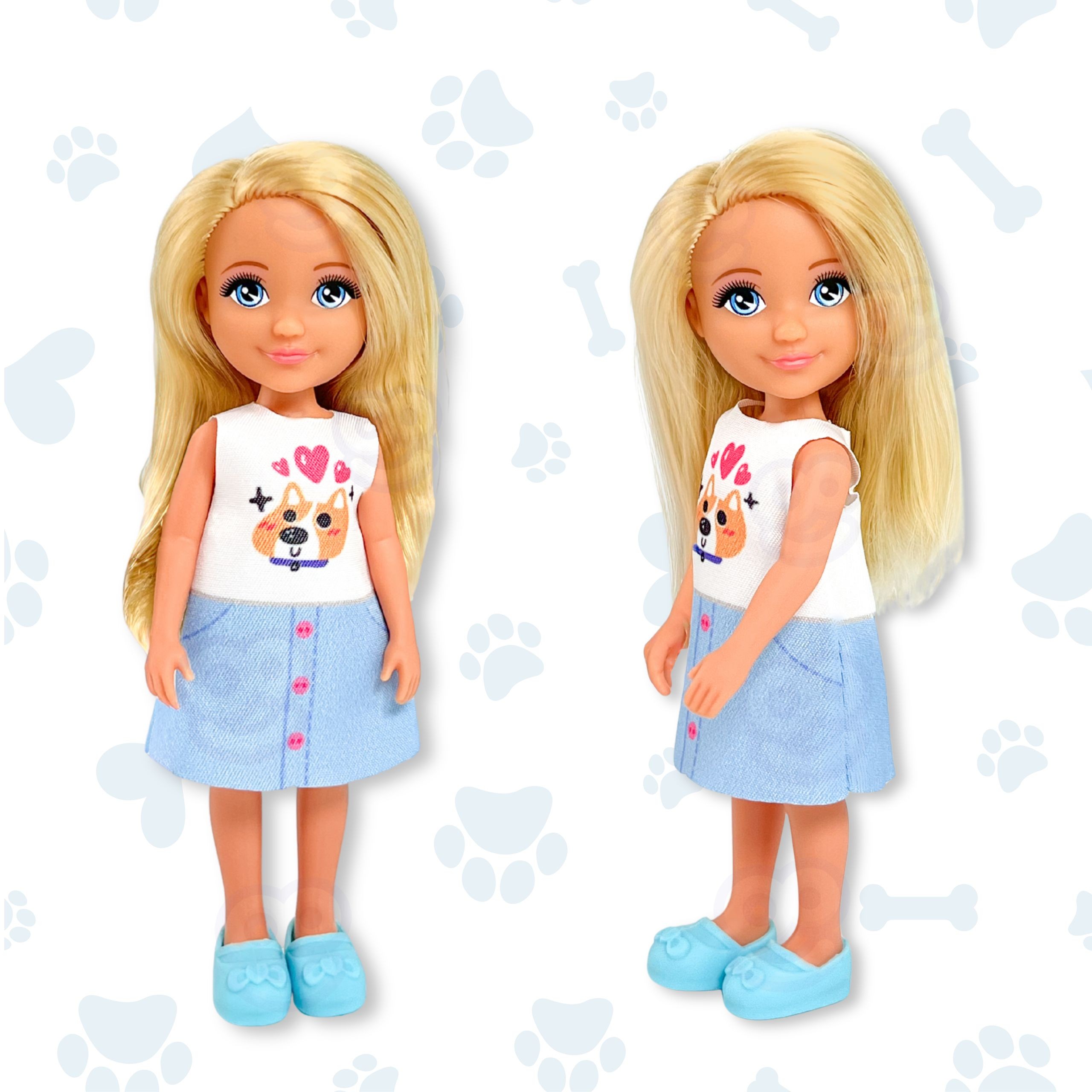 - - Śliczna laleczka z blond włosami, niebieskimi oczy, ubrana w białą bluzeczkę z uroczym nadrukiem pieska i błękitną spódniczkę.